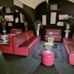 Per garantire il benessere e il massimo comfort degli ospiti la struttura mette a disposizione dei suoi clienti numerosi divani in pelle di colore rosso, molto comodi oltre che belli, sopra i quali potersi accomodare per sorseggiare un gustoso drink in assoluta comodità. O semplicemente chiacchierare con gli amici o con il partner. Davanti tali divani sono inoltre presenti dei piccoli tavoli con base in vetro arricchiti dalla presenza di piccole lampade e oggetti di vario tipo.  Le pareti sono di colore nero arricchite da bellissimi specchi, alcuni di questi con cornice colore oro.