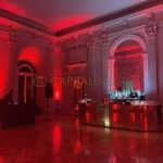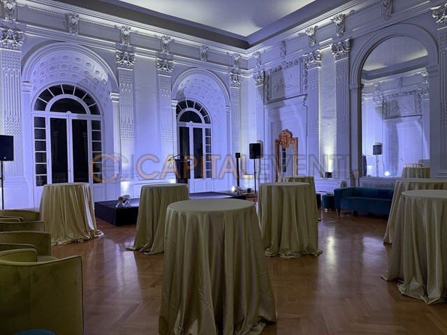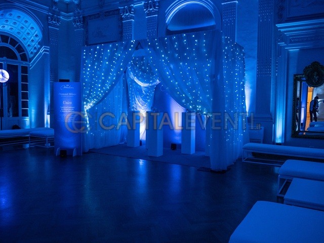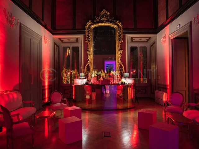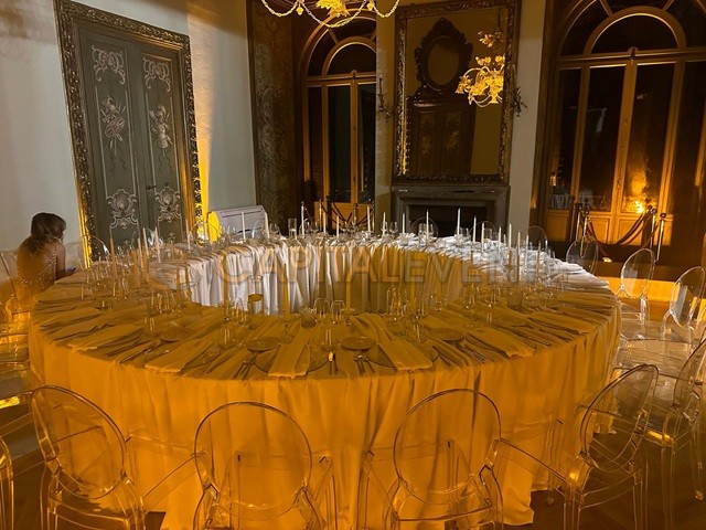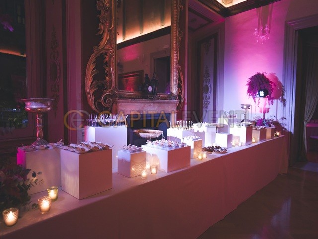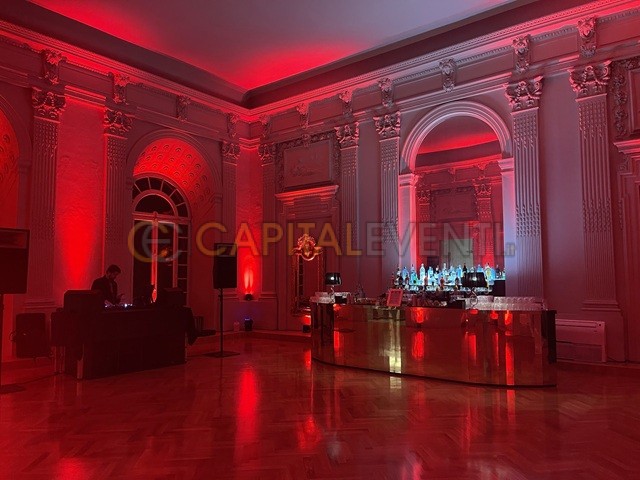 Nella sala preferita sono stati aggiunti divani e pouf moderni, un palco e un open bar, oltre alla console dj e un lungo bancone per il buffet. La luce soffusa nella tonalità scelta viene vivacizzata da spettacolari effetti luminosi, mentre qualche tavolo con sedute completa l’allestimento.